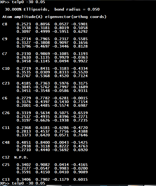 主要是你的C12没有各项异性,所以无法作图,我之前也碰到过,办法就是在ins文件里加上这样的命令,isor 0.001 c12看看这个原子有没有变为热椭球,变为了就不会出现你遇到的情况。c12不能各项异性的原因可能是吸收矫正没有做好,或者数据较差,上面是做了各项同性的处理。祝你好运! 发自小木虫Android客户端 |