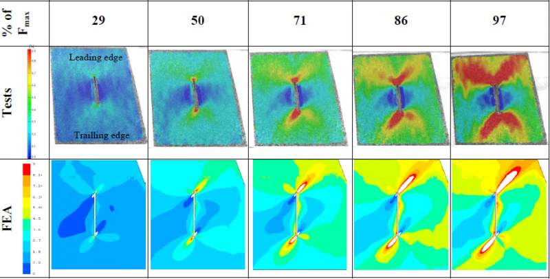 此案例中实际测试的对象为AS 350 Ecureuil直升机的尾部螺旋桨,如图1所示。首先基于samcef对测试对象进行了建模分析,然后通过损伤力学分析的方法对实际大小的尾部桨叶进行了实际测试实验,用于验证仿真模型。仿真求解器为samcef的Mecano,利用了隐式积分方法。 图2为实验室中的实际测试图,图3为samcef的模型,图4为部分测试与仿真的对比结果图。 |