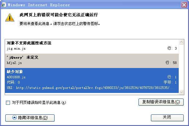 最近,不知为何在其他网页都能正常打开的情况下,只有pubmed的主页无论用360安全浏览器7.1还是IE浏览器8都不能完全打开,而且其他同学都能打开。当用IE打开时,左下角会显示黄色惊叹号,已完毕,但网页上有错误。双击后显示如图所示,具体错误如下: 网页错误详细信息: 用户代理: Mozilla/4.0 (compatible; MSIE 8.0; Windows NT 5.1; Trident/4.0; InfoPath.3; Shuame) 时间戳: Sun, 27 Sep 2015 08:02:20 UTC 消息: 对象不支持此属性或方法 行: 3 字符: 23692 代码: 0 URI: https://static.pubmed.gov/core/jig/1.14.5/js/jig.min.js 消息: 'jQuery' 未定义 行: 58 字符: 1 代码: 0 URI: https://www.ncbi.nlm.nih.gov/por ... /static/js/hfjs2.js 消息: 缺少对象 行: 1 字符: 1 代码: 0 URI: https://static.pubmed.gov/portal ... /3995963/4001808.js 真的很苦恼 ,恳请牛人支招!急求!!! ![]() 双击左下角的惊叹号后显示如图 打开主页后显示这样,不管刷多少次都这样 下拉以后感觉正常了,但输入关键词后,按search后无反应,其他的链接点击后,打开不正常 这是用IE打开后的样子 左下角显示:已完毕,但网页上有错误 |