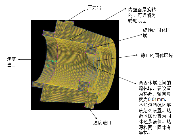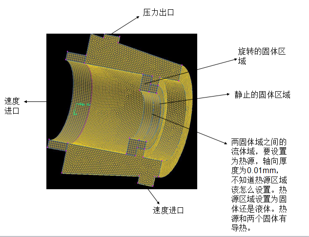需要对图中的热源进行处理,两个固体环一个是旋转环,一个是静止环,相互有摩擦生热,在摩擦的区域设置了一个热源,热源将热量传递到两个环,其次还将热量传到上面的液体区域,其次,上面液体区域的表面是旋转的。 1.png |