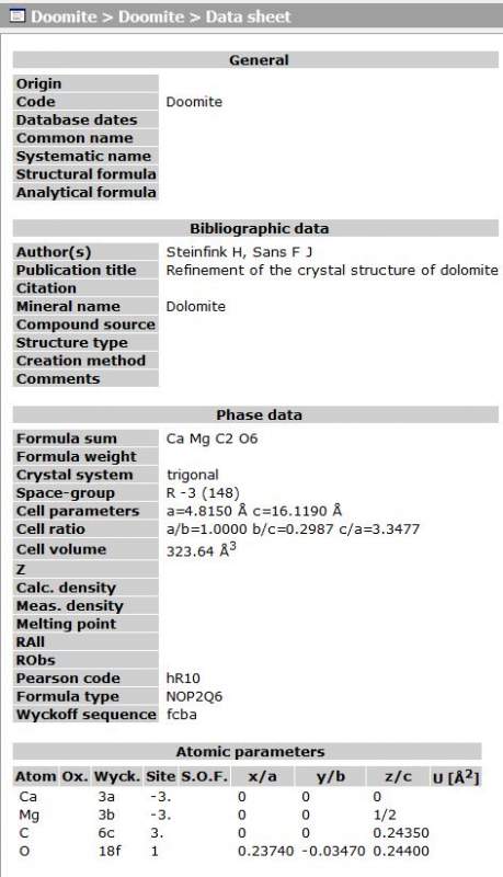 Dolomite 白云石矿物天然生长形态如下图所示: 引用网址:https://www.mineralienatlas.de/l ... ta?mineral=Dolomite 在American Mineralogist Crystal Structure Database数据库里,Dolomite的晶体结构信息文件CIF文件如附件所示(Dolomite.cif)。其具体的结构信息如下图: 利用Diamond V3.1生成的Dolomite三维晶体结构图如下: [100] 投影图 [001]投影图 Dolomite结构的GIF动画如附件(Dolomite structure GIF cartoon.gif)。 |