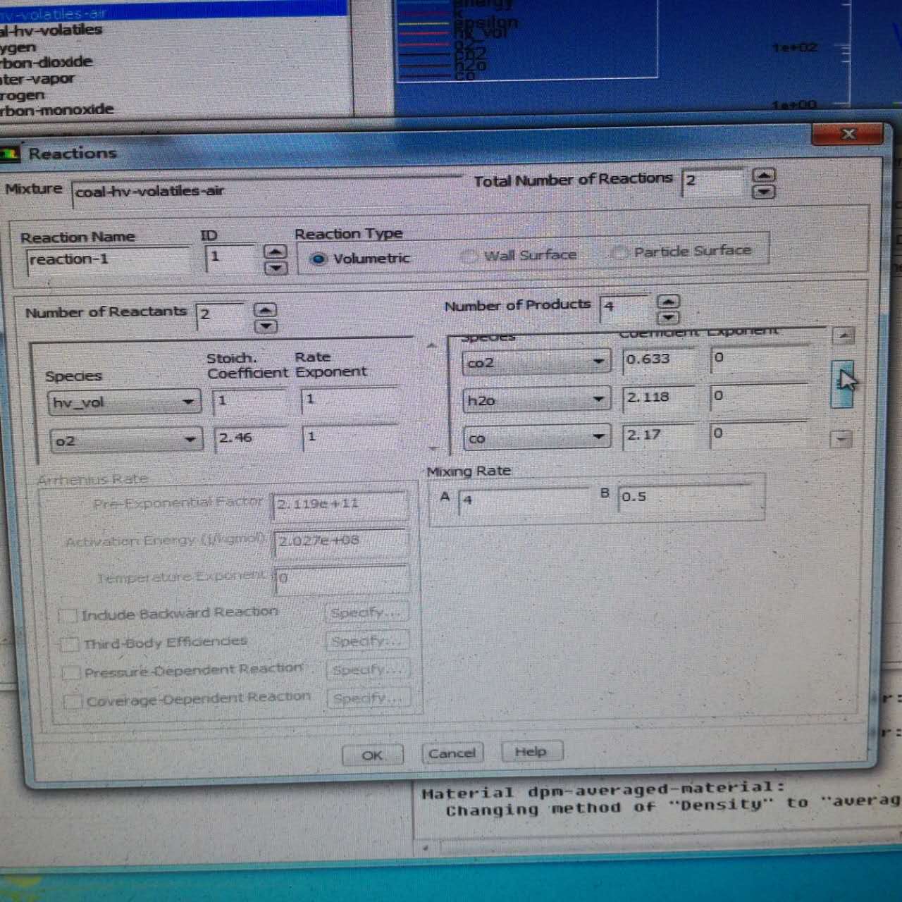 采用组分运输模型,按自带的两步化学反应方程能使煤粉点燃;但是自己给定化学反应方程,挥发分系数为1,![]() 然后进行DPM耦合的时候会出现ERROR :提示发散,我想问这个是什么原因?还有就是化学反应方程中的挥发分的系数及燃烧产物的系数该怎么给? |