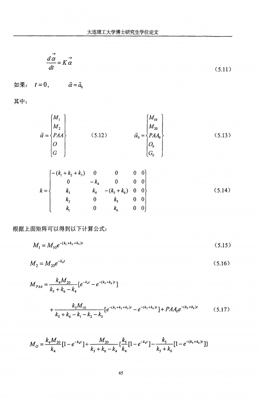 最近一直在拟合反应动力学参数,花了很大功夫试着编好了代码,却始终不能得出文献中的参数结果,求大神帮忙指点一下程序。在此拜谢了。 code: function KineticsEst5 clear all clc k0 = [0.5 0.5 0.5 0.5 0.5 0.5]; % 参数初值 lb = [0 0 0 0 0 0]; % 参数下限 ub = [+inf +inf +inf +inf +inf +inf]; % 参数上限 x0 = [4.96 24.43 26.32 17 38.72]; ExpData = ... [ 0 4.96 24.43 26.32 5 5.635 28.29 30.715 10 6.31 32.15 35.11 15 6.77 34.225 34.98 20 7.23 36.3 34.85 25 7.065 39.285 33.525 30 6.9 42.27 32.2 35 7.08 45.46 29.7 40 7.26 48.65 27.2 50 8 51.215 24.495 60 8.74 53.78 21.79 75 8.605 58.01 19.12 90 8.47 62.24 16.45 ] yexp = ExpData(:,2:4); % 使用函数fmincon()进行参数估计 [k,fval,flag] = fmincon(@ObjFunc4Fmincon,k0,[],[],[],[],lb,ub,[],[],x0,yexp); fprintf(\\\'\\\\n使用函数fmincon()估计得到的参数值为:\\\\n\\\') fprintf(\\\'\\\\tk1 = %.4f\\\\n\\\',k(1)) fprintf(\\\'\\\\tk2 = %.4f\\\\n\\\',k(2)) fprintf(\\\'\\\\tk3 = %.4f\\\\n\\\',k(3)) fprintf(\\\'\\\\tk4 = %.4f\\\\n\\\',k(4)) fprintf(\\\'\\\\tk5 = %.4f\\\\n\\\',k(5)) fprintf(\\\'\\\\tk6 = %.4f\\\\n\\\',k(6)) fprintf(\\\' The sum of the squares is: %.1e\\\\n\\\\n\\\',fval) k_fmincon = k; % 以函数fmincon()估计得到的结果为初值,使用函数lsqnonlin()进行参数估计 k0 = k_fmincon; [k,resnorm,residual,exitflag,output,lambda,jacobian] = ... lsqnonlin(@ObjFunc4LNL,k0,lb,ub,[],x0,yexp); ci = nlparci(k,residual,jacobian); fprintf(\\\'\\\\n\\\\n以fmincon()的结果为初值,使用函数lsqnonlin()估计得到的参数值为:\\\\n\\\') fprintf(\\\'\\\\tk1 = %.4f ± %.4f\\\\n\\\',k(1),ci(1,2)-k(1)) fprintf(\\\'\\\\tk2 = %.4f ± %.4f\\\\n\\\',k(2),ci(2,2)-k(2)) fprintf(\\\'\\\\tk3 = %.4f ± %.4f\\\\n\\\',k(3),ci(3,2)-k(3)) fprintf(\\\'\\\\tk4 = %.4f ± %.4f\\\\n\\\',k(4),ci(4,2)-k(4)) fprintf(\\\'\\\\tk5 = %.4f ± %.4f\\\\n\\\',k(5),ci(5,2)-k(5)) fprintf(\\\'\\\\tk6 = %.4f ± %.4f\\\\n\\\',k(6),ci(6,2)-k(6)) fprintf(\\\' The sum of the squares is: %.1e\\\\n\\\\n\\\',resnorm) % ------------------------------------------------------------------ function f = ObjFunc4Fmincon(k,x0,yexp) tspan = [0,5,10,15,20,25,30,35,40,50,60,75,90]; [t x] = ode45(@KineticEqs,tspan,x0,[],k); y(:,1:3) = x(:,1:3); f = sum((y(:,1)-yexp(:,1)).^2) + sum((y(:,2)-yexp(:,2)).^2) + sum((y(:,3)-yexp(:,3)).^2); % ------------------------------------------------------------------ function f = ObjFunc4LNL(k,x0,yexp) tspan = [0,5,10,15,20,25,30,35,40,50,60,75,90]; [t x] = ode45(@KineticEqs,tspan,x0,[],k); y(:,1:3) = x(:,1:3); f1 = y(:,1) - yexp(:,1); f2 = y(:,2) - yexp(:,2); f3 = y(:,3) - yexp(:,3); f = [f1; f2; f3]; % ------------------------------------------------------------------ function dxdt = KineticEqs(t,x,k) dxdt = ... [ (k(1)*x(1)+k(6)*x(3)) (k(2)*x(1)+k(5)*x(3)) (k(3)*x(1)+k(4)*x(2)-(k(5)+k(6))*x(3)) (-(k(1)+k(2)+k(3))*x(1)) (-k(4)*x(2)) ]; |