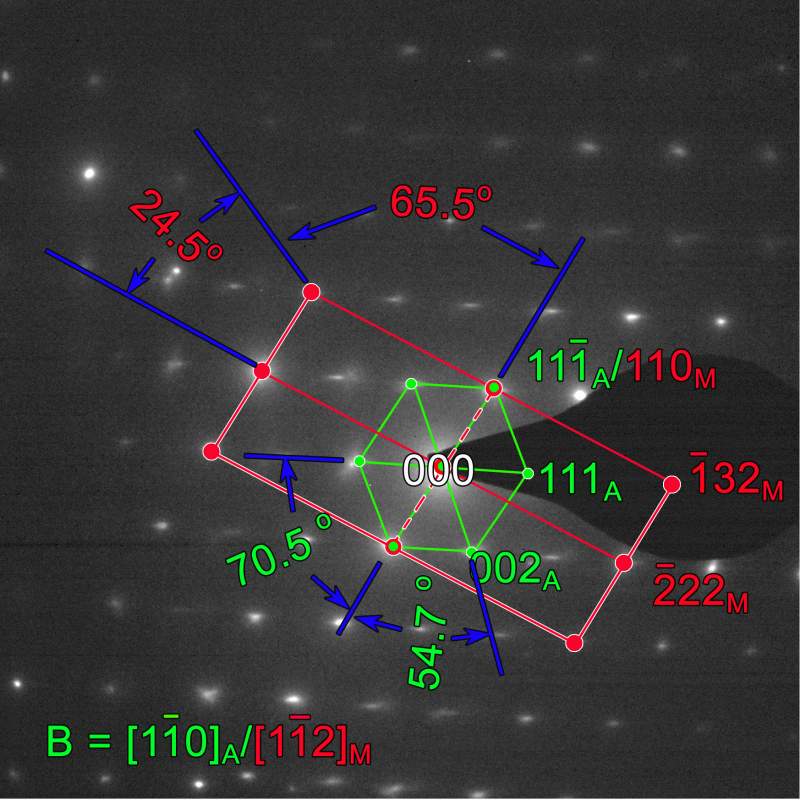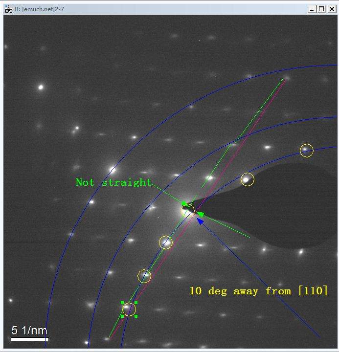 | 新手,请各位帮我标定一下这张衍射图!应该是奥氏体和马氏体的衍射斑,刚学TEM,我用DM测量衍射斑之间的距离然后取倒数,得到的d值和PDF卡片上的d值总是对不上,差得较多,角度也不对,请大家帮帮忙!谢谢! 还有,从CCD图上能得到相机常数吗?求解答,谢谢! |