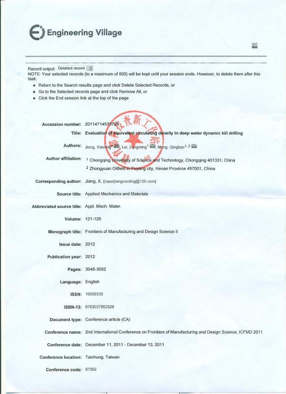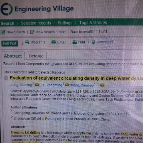 | 各位师兄,本人的一篇英文论文题目为《Evaluation of equivalent circulatiing density in deep water dynamic kill drilling》,跪求各位帮忙查询一下有没有被EI收录,包含作者名:Meng qingbao,小弟万分感谢! |