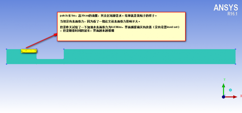 油水互不相溶,密度相差不大(水998,油840) t=0时刻,油膜是通过patch的 随着时间的推移,水流不断冲刷油膜,油水的界面越来越不清晰 请问fluent中没有油水界面重构的方法吗?上图的看似“界面”的线其实不是界面,如果是界面,那么界面里的油的体积分数应该是1,而不是0-1之间的数值 |