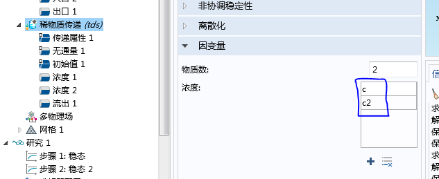 还有就是稀物质传递场中设置的浓度c 和c2,这两个量对应的材料是如何设置的呢?