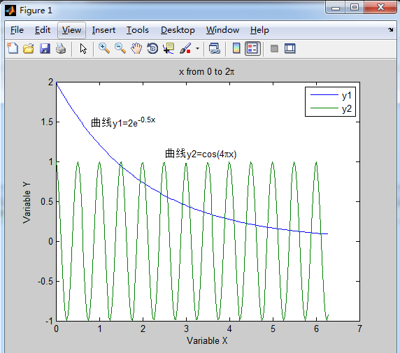 x=0:pi/100:2*pi; y1=2*exp(-0.5*x); y2=cos(4*pi*x); plot(x,y1,x,y2) title('x from 0 to 2{\pi}'); xlabel('Variable X'); ylabel('Variable Y'); text(0.8,1.5,'曲线y1=2e^{-0.5x}'); text(2.5,1.1,'曲线y2=cos(4{\pi}x)'); legend('y1','y2') |