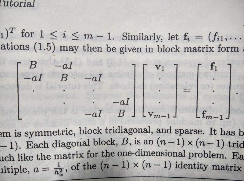 对于一维边值问题,泊松方程离散后得到的线性方程组的系数矩阵为三对角矩阵,将该矩阵主对角线上的元素换成相应的三对角方阵,相邻斜线上的元素换成相应的单位方阵,我们就可以得到相应二维问题的系数矩阵。 图片里的方程就是针对二维问题的,其中B是相应的三对角方阵,I是相应的单位方阵。 但是三维问题的线性方程组的系数还可以用矩阵来表示吗,矩阵是什么样子的呢,能不能麻烦给出一个一般的例子,谢谢! |