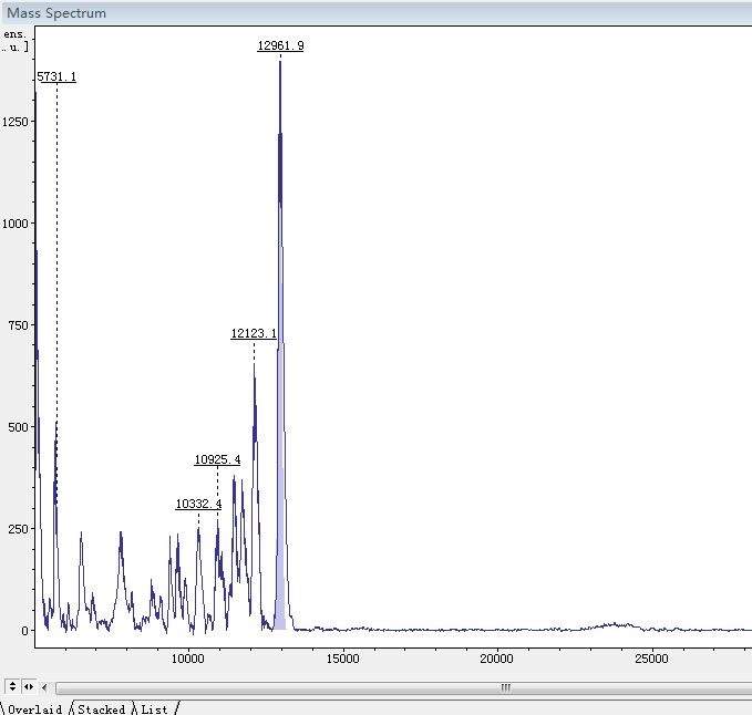 MALDI-TOF/TOF 质谱测得的分子量的图,用ExPASy预测出我的蛋白的理论Mw (average) 是 17385.72 ,可是图上没有与此符合的峰值,不知出了什么问题,蛋白是纯化出来的,纯度>90%。还有这种谱图怎么看,希望大神指教,谢谢! |