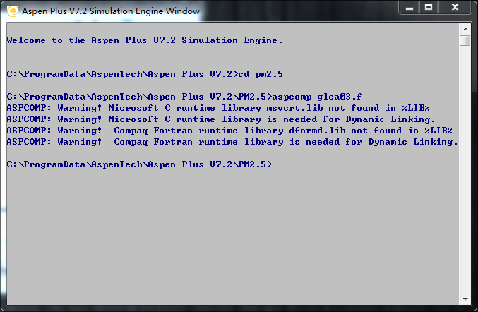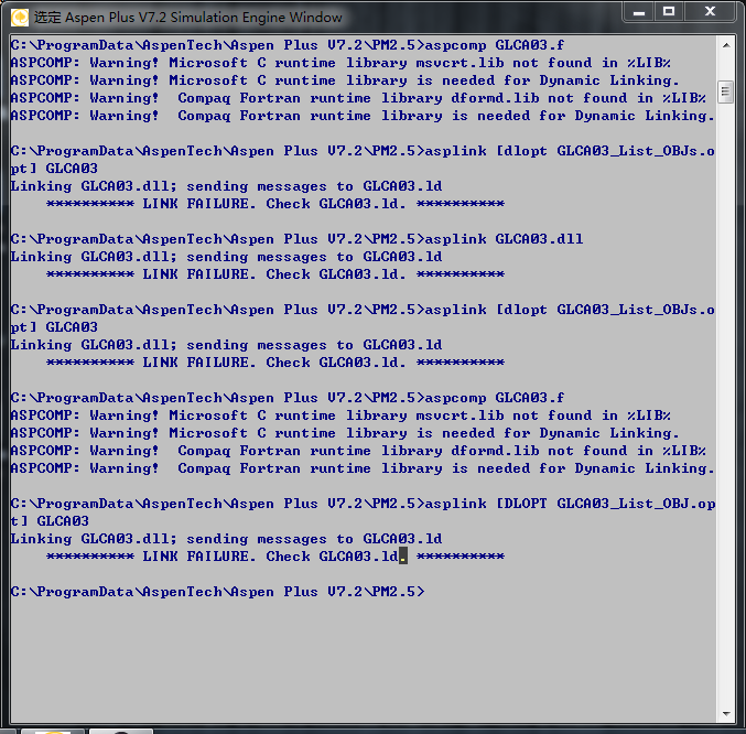 我用Fortran程序谢了一个代码,要编译后连接到Aspen中去,可是用aspcomp编译的时候就一直出现这样的警告,然后用asplink连接就一直是failure,我按照警告信息,把not found的两个文件找到,拷贝到自己的运行目录下,再次编译和连接,还是同样的错误。请各位虫友帮忙解答一下,不胜感激!!如下图: |