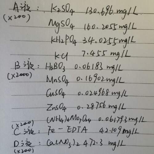 如,全天曝题,从培养皿移苗至遮光盆中,头三天加了二分之一营养液,母液浓度如图,药品含结晶水的我一律没在图里标明。ph在7.1。每天早九点到晚十点开培养灯,感觉温度在28-30度左右气。以前其他人一直用的这种培养液,不知道为什么我这次培会这样。 今天是移苗后第四天,发现最下面的老叶非常小,不长了且基本枯萎,其他大的叶子长的挺好。不知道这是为什么,还是这是正常的?我是水培新手还望能多多指导包涵,谢谢! 发自小木虫Android客户端 |