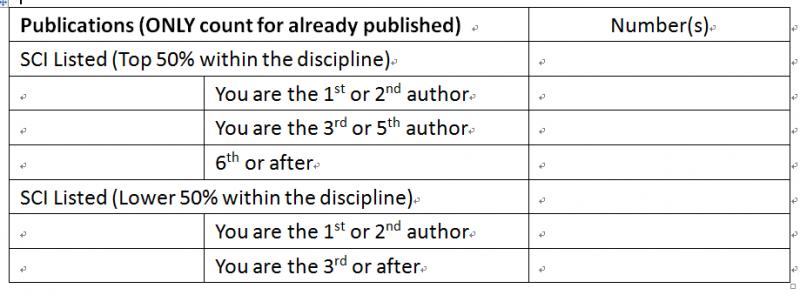 就是你发的sci,发的杂志在本学科排名前50%的,你是第一第二作者的几个,第三到五作者的几个,第六以后的几个。发的杂志差些,排后50%的,你是相应作者的各几篇