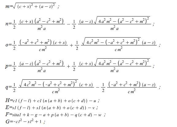 q:=((sqrt(4*c^2*m^2-(m^2+c^2-a^2)^2))/(2*c*m))*((x+c)/m)-((m^2+c^2-a^2)/(2*c*m))*((a-z)/m);