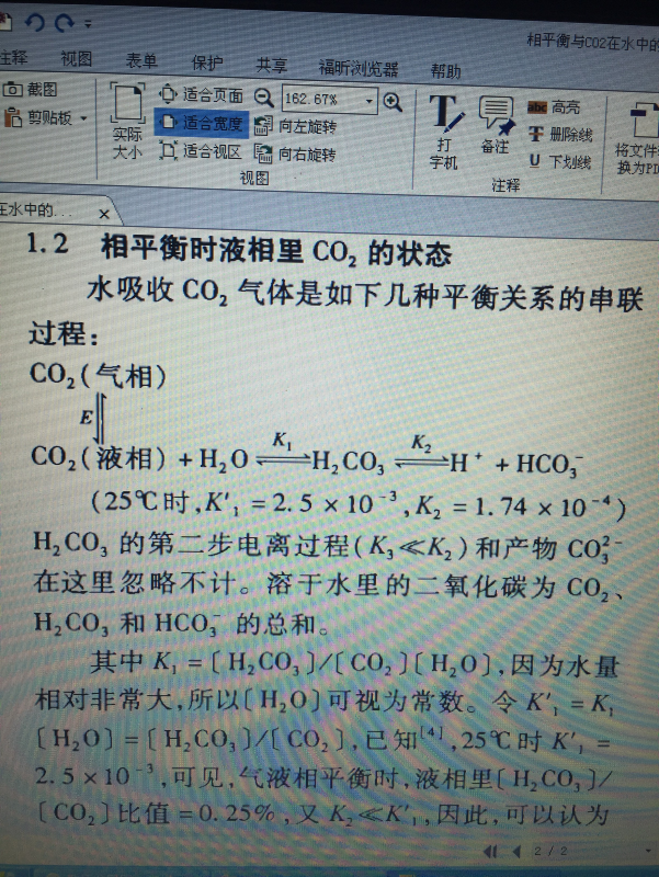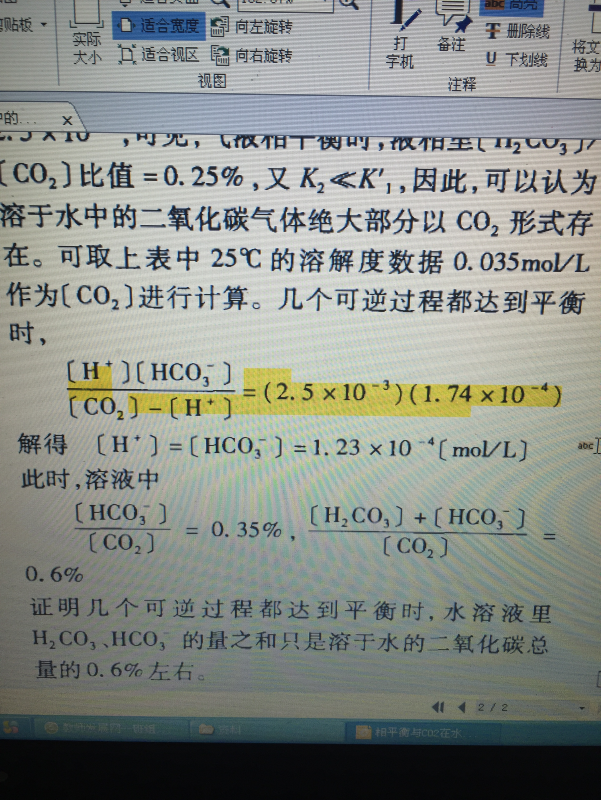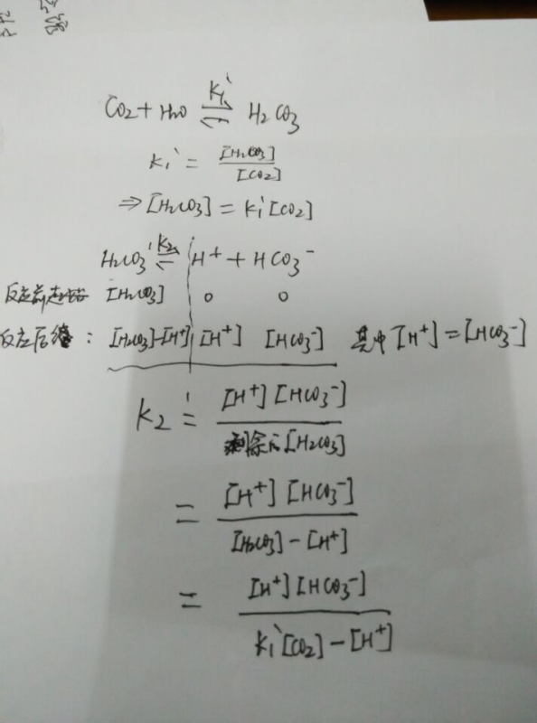 有点瑕疵,修正一下: K1=[H2CO3]/([CO2][H2O])---->>K1'=K1[H2O]=[H2CO3]/[CO2]=2.5*10^-3 K2=[H+][HCO3-]/[H2CO3]=1.74*10^-4 =[H+][HCO3-]/K1'[CO2] 又由于K3=[H+][CO32-]/[HCO3-]<<K2, Kw=[H+][OH-]=10^-14<<K2,故而全部忽略。 即[CO32-]<<[HCO3-]和[0H-]<<[H+],可以忽略。那么: 电荷平衡式:[H+]=2[CO32-]+[HCO3-]+[0H-]=[HCO3-] C元素平衡式: SCO2=[CO2]+[CO32-]+[HCO3-]+[H2CO3] =[CO2]+[HCO3-]+[H2CO3] =[CO2]+[HCO3-]+K1'[CO2] 即[CO2]=(SCO2-[HCO3-])/(1+k1')=(SCO2-[H+])/(1+k1') 由于k1'=2.5*10^-3 <<1,故而忽略,从而[CO2]=(SCO2-[H+]) 于是K2=[H+][HCO3-]/[H2CO3]= [H+][HCO3-]/K1'[CO2] =[H+][HCO3-]/ K1'(SCO2-[H+]) 结合电荷平衡式[H+]=[HCO3-],有[H+][HCO3-]/(SCO2-[H+])=[H+]^2/(SCO2-[H+])=K1'K2,即 [H+]^2=K1'K2(SCO2-[H+])=2.5*10^-3 *1.74*10^-4*(0.035-[H+])=4.25*10^-7(0.035-[H+]) [H+]=[HCO3-]=1.22*10^-4 |