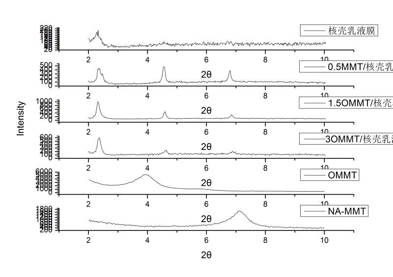 求助!有机蒙脱土/丙烯酸酯核壳乳液膜的XRD图分析,很奇怪的!