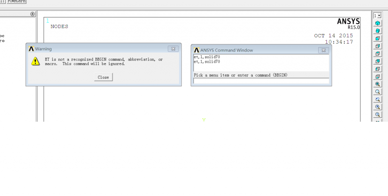 装的ANSYS 2015,在命令流里定义单元类型时总提示命令无法识别,如et,1,solid70,回车后显示命令无法识别的警示,请教高手这是什么原因,该如何解决?