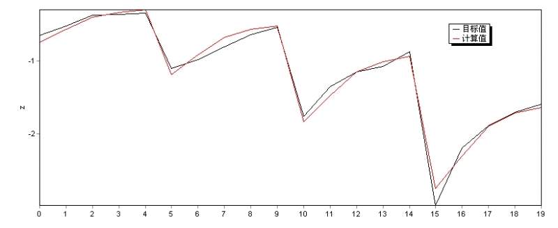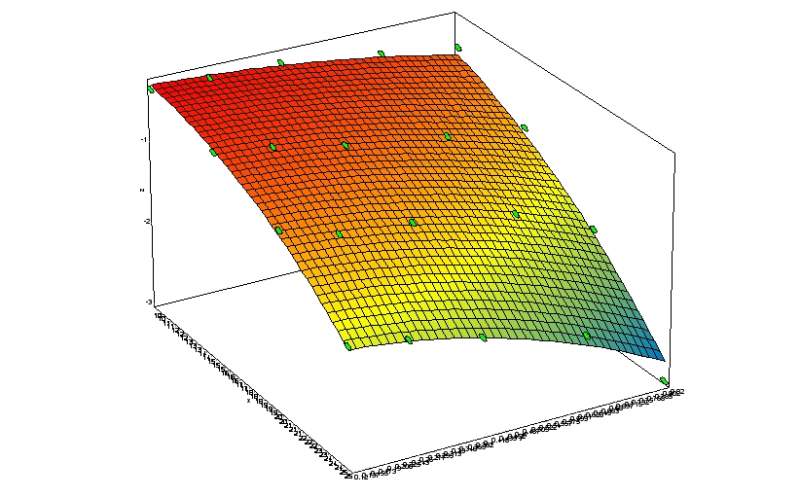 以下是使用响应曲面分析的结果,拟合相当好。 分析是使用已编码单位进行的。 f 的估计回归系数 项 系数 系数标准误 T P 常量 -0.9526 0.04849 -19.646 0.000 x -0.8090 0.03130 -25.845 0.000 y -0.3722 0.03199 -11.634 0.000 x*x -0.2610 0.05230 -4.990 0.000 y*y -0.1356 0.05823 -2.329 0.035 x*y -0.2395 0.04291 -5.582 0.000 S = 0.103954 PRESS = 0.423496 R-Sq = 98.37% R-Sq(预测) = 95.44% R-Sq(调整) = 97.79% f 的方差分析 来源 自由度 Seq SS Adj SS Adj MS F P 回归 5 9.14326 9.14326 1.82865 169.22 0.000 线性 2 8.47888 8.68098 4.34049 401.65 0.000 x 1 7.00408 7.21825 7.21825 667.95 0.000 y 1 1.47479 1.46273 1.46273 135.36 0.000 平方 2 0.32770 0.32770 0.16385 15.16 0.000 x*x 1 0.26908 0.26908 0.26908 24.90 0.000 y*y 1 0.05862 0.05862 0.05862 5.42 0.035 交互作用 1 0.33668 0.33668 0.33668 31.16 0.000 x*y 1 0.33668 0.33668 0.33668 31.16 0.000 残差误差 14 0.15129 0.15129 0.01081 合计 19 9.29455 f 的异常观测值 拟合值 标准化 观测值 标准序 f 拟合值 标准误 残差 残差 16 16 -2.985 -2.770 0.077 -0.215 -3.10 R R 表示此观测值含有大的标准化残差 f 的估计回归系数,使用未编码单位的数据 项 系数 常量 -0.981061 x 0.0974056 y 1.57416 x*x -0.00463962 y*y -1.10716 x*y -0.0912496 |