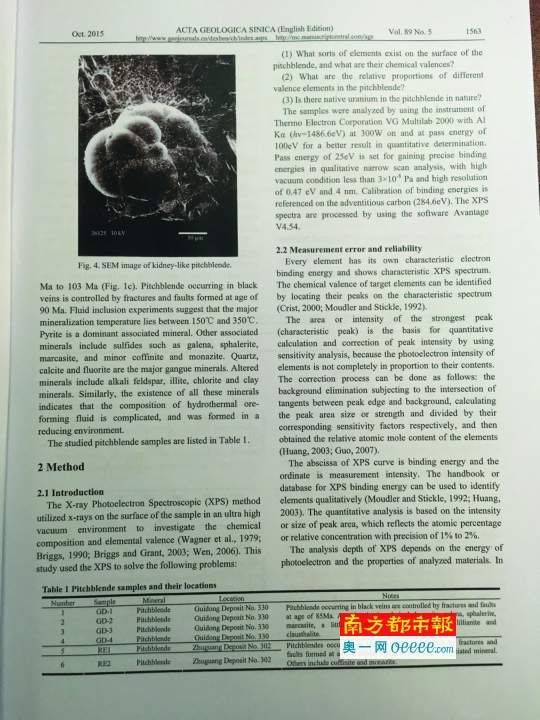 团队成员黄志章介绍,其实早在2011年,科研人员就开始用光电子能谱方法对沥青铀矿石进行分析,并发现了金属铀的存在。但在当时,这一发现没有经过完全的验证。在之后的4年多时间里,研究团队采集分析了各地的铀矿石,并把探测结果与人工金属铀和氧化还原铀进行反复对比,确认无误后,才于近期将研究成果发表在《地质学报》(英文版)上。
