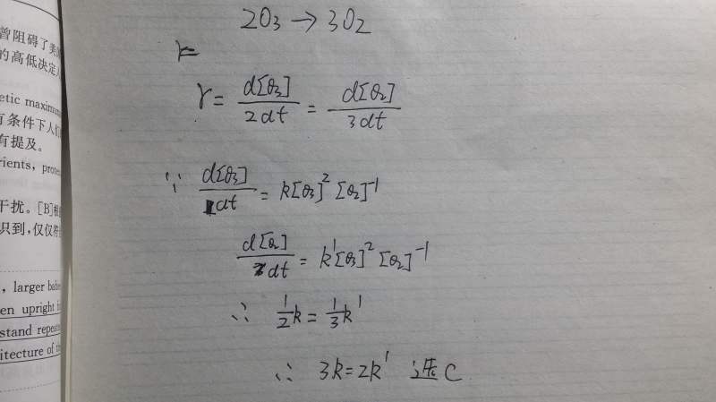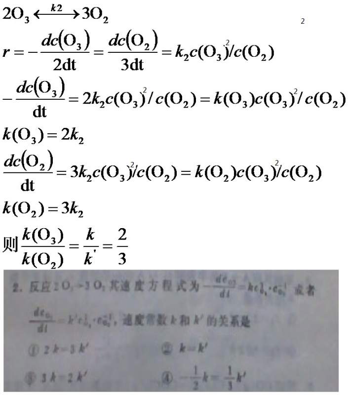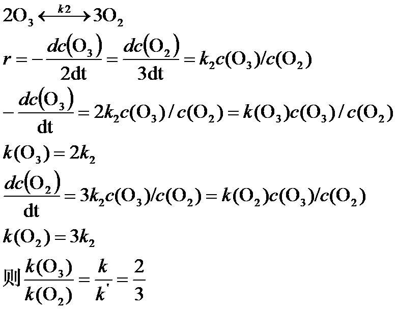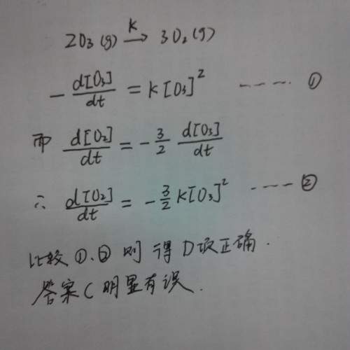 反应2O3→3O2其速率方程式若为d (O3) / dt = k (O3)2 (O2)-1或d(O2)/dt = k'(O3)2 (O2)-1 ,则速率常数和k'的关系是( ) a. 2k=3k' b. k=k' c. 3k=2k' d. –1/2k=1/3k' 我查到的答案是C,但我觉得是D。 因为-1/2 d[O3]/dt = 1/3 d[O2]/dt,代入题干上的两个速率方程,那k和k’之间的关系得有个负号才行啊。 求指教 = = |