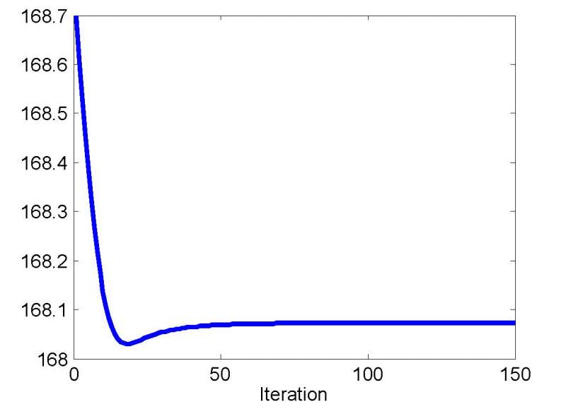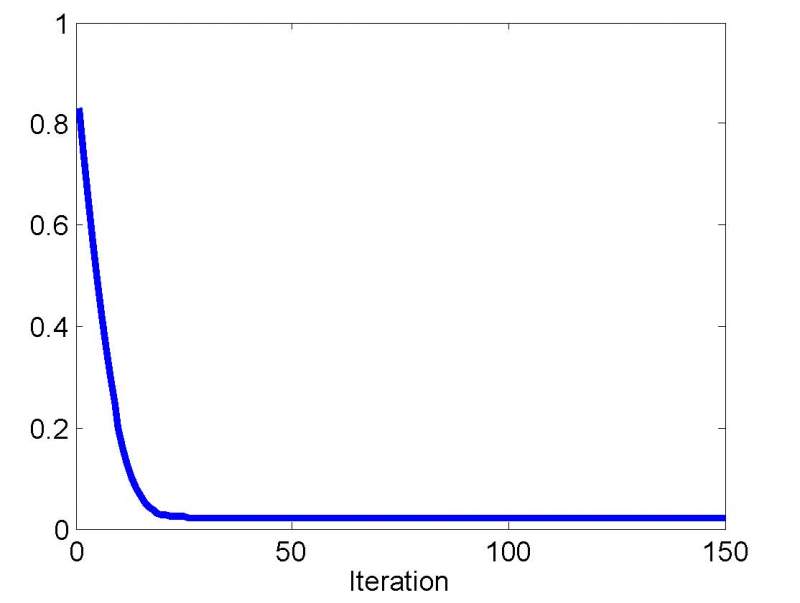 请问,参数是不是对收敛性有影响呢? 下面两幅图是在不同参数下得到的收敛曲线,都算是好的收敛结果吗? 另外按最小化目标函数来说,下面那幅图是不是更好,毕竟目标函数值更小? 参数值较大时 (该幅图,迭代150时,后面还有小幅振荡,但已是几位有效数字之后的了 ,比如1e-5数量级) 参数值较小时 |