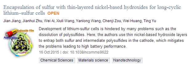 Nature com.上新出的锂硫电池文章,跟大家讨论分享一下:![]() http://www.nature.com/ncomms/201 ... ull/ncomms9622.html Encapsulation of sulfur with thin-layered nickel-based hydroxides for long-cyclic lithium–sulfur cells Abstract:Elemental sulfur cathodes for lithium/sulfur cells are still in the stage of intensive research due to their unsatisfactory capacity retention and cyclability. The undesired capacity degradation upon cycling originates from gradual diffusion of lithium polysulfides out of the cathode region. To prevent losses of certain intermediate soluble species and extend lifespan of cells, the effective encapsulation of sulfur plays a critical role. Here we report an applicable way, by using thin-layered nickel-based hydroxide as a feasible and effective encapsulation material. In addition to being a durable physical barrier, such hydroxide thin films can irreversibly react with lithium to generate protective layers that combine good ionic permeability and abundant functional polar/hydrophilic groups, leading to drastic improvements in cell behaviours (almost 100% coulombic efficiency and negligible capacity decay within total 500 cycles). Our present encapsulation strategy and understanding of hydroxide working mechanisms may advance progress on the development of lithium/sulfur cells for practical use. QQ图片20151017104712.png |