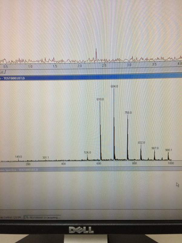仪器型号是1100LC/MS Trap SL,流动相选的是水(A)+甲醇(B),对标准品(分子量为690)进行检测。 测了很多次,始终检测不出该物质。 对空白样进行检测,会出现很多的杂峰,而且很有规律(每个峰之间相差74[m/z]),具体如图所示: 水是买的屈臣氏蒸馏水,在别的仪器上检测并没有出现该问题。很困扰,希望大家指点! |
