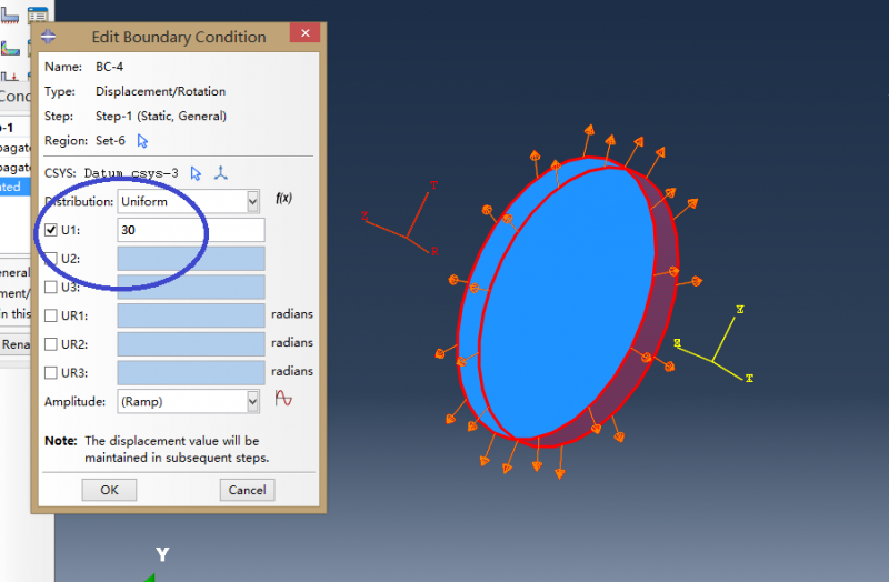在ABAQUS中创建了一个圆板和圆筒,希望圆板被径向拉伸之后,和圆筒接触并使圆筒发生形变。但无论圆板的位移载荷数值(U1,蓝色圈出部分)调成多大结果都移动到相同的位置并且不与圆筒发生接触,求助。。。具体如图 1png.png 2.jpg 3.jpg 4.png |