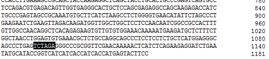 目的基因完整序列,共有1746个碱基:atggcg gtgcgacagg cgctgggccg 121 cggcctgcag ctgggtcgag cgctgctgct gcgcttcacg ggcaagcccg gccgggccta 181 cggcttgggg cggccgggcc cggcggcggg ctgtgtccgc ggggagcgtc caggctgggc 241 cgcaggaccg ggcgcggagc ctcgcagggt cgggctcggg ctccctaacc gtctccgctt 301 cttccgccag tcggtggccg ggctggcggc gcggttgcag cggcagttcg tggtgcgggc 361 ctggggctgc gcgggccctt gcggccgggc agtctttctg gccttcgggc tagggctggg 421 cctcatcgag gaaaaacagg cggagagccg gcgggcggtc tcggcctgtc aggagatcca 481 ggcaattttt acccagaaaa gcaagccggg gcctgacccg ttggacacga gacgcttgca 541 gggctttcgg ctggaggagt atctgatagg gcagtccatt ggtaagggct gcagtgctgc 601 tgtgtatgaa gccaccatgc ctacattgcc ccagaacctg gaggtgacaa agagcaccgg 661 gttgcttcca gggagaggcc caggtaccag tgcaccagga gaagggcagg agcgagctcc 721 gggggcccct gccttcccct tggccatcaa gatgatgtgg aacatctcgg caggttcctc 781 cagcgaagcc atcttgaaca caatgagcca ggagctggtc ccagcgagcc gagtggcctt 841 ggctggggag tatggagcag tcacttacag aaaatccaag agaggtccca agcaactagc 901 ccctcacccc aacatcatcc gggttctccg cgccttcacc tcttccgtgc cgctgctgcc 961 aggggccctg gtcgactacc ctgatgtgct gccctcacgc ctccaccctg aaggcctggg 1021 ccatggccgg acgctgttcc tcgttatgaa gaactatccc tgtaccctgc gccagtacct 1081 ttgtgtgaac acacccagcc cccgcctcgc cgccatgatg ctgctgcagc tgctggaagg 1141 cgtggaccat ctggttcaac agggcatcgc gcacagagac ctgaaatccg acaacatcct 1201 tgtggagctg gacccagacg gctgcccctg gctggtgatc gcagattttg gctgctgcct 1261 ggctgatgag agcatcggcc tgcagttgcc cttcagcagc tggtacgtgg atcggggcgg 1321 aaacggctgt ctgatggccc cagaggtgtc cacggcccgt cctggcccca gggcagtgat 1381 tgactacagc aaggctgatg cctgggcagt gggagccatc gcctatgaaa tcttcgggct 1441 tgtcaatccc ttctacggcc agggcaaggc ccaccttgaa agccgcagct accaagaggc 1501 tcagctacct gcactgcccg agtcagtgcc tccagacgtg agacagttgg tgagggcact 1561 gctccagcga gaggccagca agagaccatc tgcccgagta gccgcaaatg tgcttcatct 1621 aagcctctgg ggtgaacata ttctagccct gaagaatctg aagttagaca agatggttgg 1681 ctggctcctc caacaatcgg ccgccacttt gttggccaac aggctcacag agaagtgttg 1741 tgtggaaaca aaaatgaaga tgctctttct ggctaacctg gagtgtgaaa cgctctgcca 1801 ggcagccctc ctcctctgct catggagggc agccctgtga |