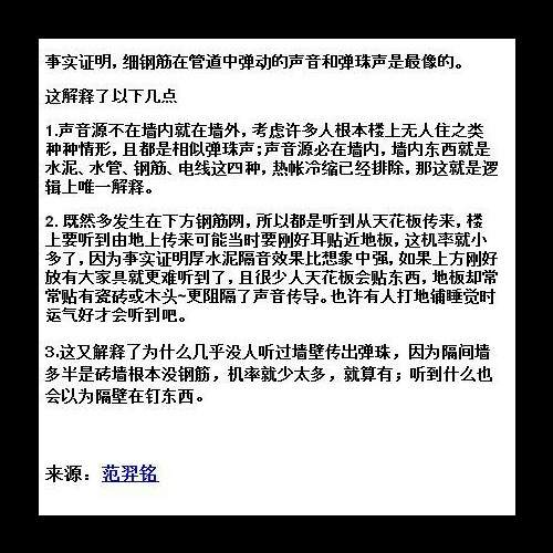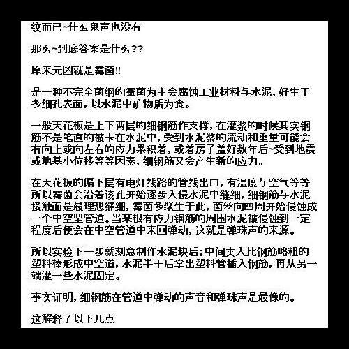 近期,家里天花板频繁传来疑似楼上住户拖动家具的声音(问了楼上,说没有拖动,可是,听起来确实很像),有一篇帖子说是混凝土被霉菌侵蚀,造成钢筋不密实而出现窜动,请教专业人士如何判断这种声音来源。 发自小木虫Android客户端 |