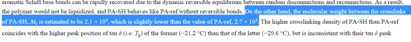 原文是这样的:“On the other hand, the molecular weight between the crosslinks of PA-SH, Mc is estimated to be 2.1 × 103, which is slightly lower than the value of PA-ref, 2.7 × 103.” QQ浏览器截屏未命名.png |