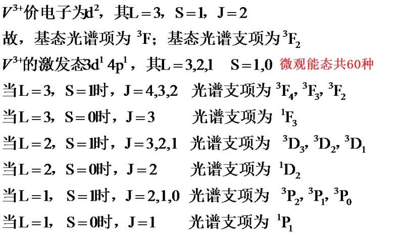 V3+基组态:1s2 2s2 2p6 3s2 3p6 3d2 4s0 的光谱项和光谱支项 V3+第一激发态:1s2 2s2 2p6 3s2 3p6 3d1 4p1 的光谱项和光谱支项 都请帮我写一下,万分感谢!!! |