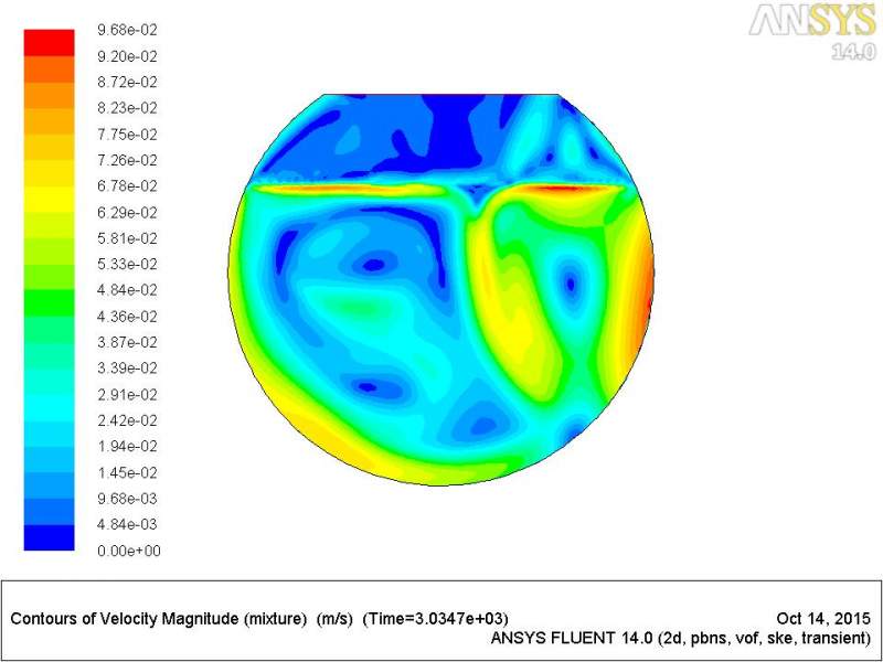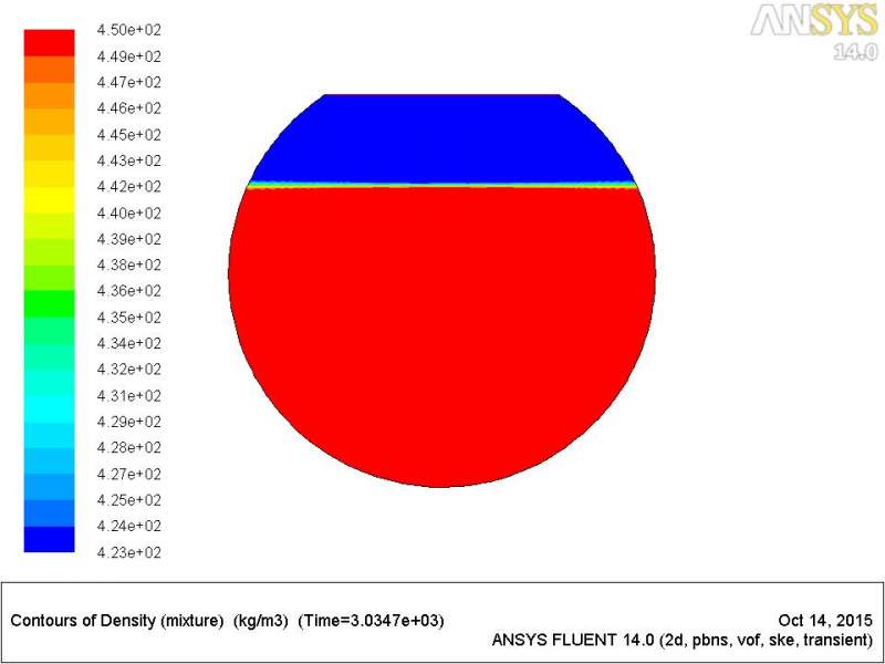 我用的是二维模型,一个球形储罐,上下两层为密度不同的不可压缩液体,四周边壁有热流,上面设置为压力出口。为什么计算了很久密度和温度一直不变啊?我初始温度设定的是111K。有没有大神啊![]() fluent-46-291500.jpg fluent-46.jpg |