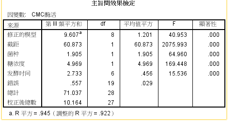 我采用C菌株和T菌株分别在2%,3%糖浓度下发酵12h-48h,测得CMC酶活如图1(没有平行组数据),现在需要对其进行显著性差异分析,我选取菌株、糖浓度、发酵时间为自变量,酶活为因变量,按照多因素方差分析进行分析得到结果如下图2所示。请问,为什么三个因素都显著?我这种分析是否存在问题?还有没有其他的分析方法?恳请指教!!!! 1.png 2.png |