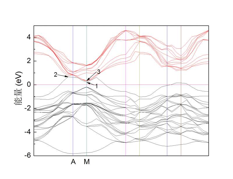 各位大侠,最近用MS计算了一种掺杂半导体的能带结构,结果显示:价带与导带有重叠,即禁带宽度为负值(很多文献也已经证明此计算结果)。但不明白这个负值究竟是怎么得到的。如图箭头所指的1、2、3点分别为价带最低点、价带最高点、导带最低点,禁带宽度的负值究竟是上述三点的哪两个之间的差值?请各位大侠不吝赐教。另外,我研究的材料是直接带隙半导体,未掺杂时价带和导带的最值位于M对称点。 Graph1.jpg |