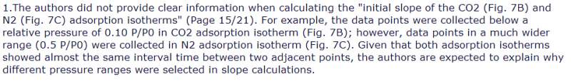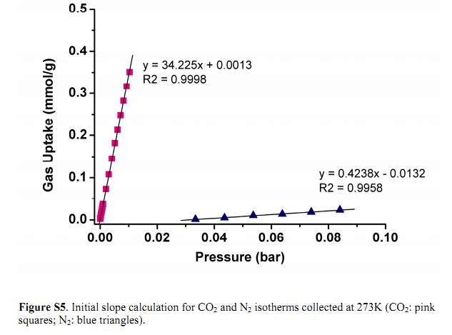 用吸附等温线的起始斜率算CO2/N2的选择比时应该如何选点?是选开始那几个点,还是选择一定压力范围的? 以下是审稿人的问题: 以下是我文章的图: 我作图的时候,只是考虑选择开始那些线性好的点,没考虑选点数目和压力范围的问题。另外我看了别人做的一些mof材料算选择比的时候,选点也是没有一个定则的。 例如:发表在jacs的J. AM. CHEM. SOC. 2010, 132, 38–39 |