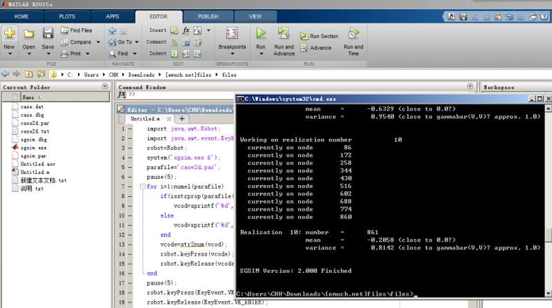 import java.awt.Robot; import java.awt.event.KeyEvent; robot=Robot; system('sgsim.exe &'); parafile='case2d.par'; pause(5); for i=1:numel(parafile) if(isstrprop(parafile(i),'alpha')) vcod=sprintf('%d',upper(parafile(i))); else vcod=sprintf('%d',parafile(i)); end vcode=str2num(vcod); robot.keyPress(vcode); robot.keyRelease(vcode); end pause(5); robot.keyPress(KeyEvent.VK_ENTER); robot.keyRelease(KeyEvent.VK_ENTER); 我也是醉了, 有更好的方法你不去弄。让你找找你的软件的命令行格式。也不找。 这能用这种机器模拟输入的办法了。这种要设延时,程序执行效率低。但肯定是你期望的了。 |
