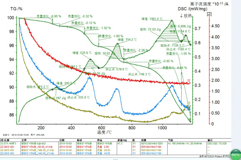 看TGA曲线似乎很复杂啊... dTG曲线看似乎有5个峰,不过这也不说明什么问题啊 ![]() 我的理解是:该样品如lz所说是“煤还原铁氧化物”的TGA; 那么要分析,还需:煤自身的TGA;铁氧化物的TGA;如果可能的话,还要做“铁氧化物还原产物”的TGA,观察是否有对应的失重峰~~ 当然,如果知道还原产物中铁的价态会对后续反应有帮助~~ BTW,热重气氛是N2还是空气? |