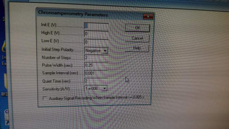 小弟刚接触电化学,想要在0.65V到-1.3V之间进行电化学阶跃实验,频率为500hz,时间250s。如何设置? 用什么技术?频率和时间怎么设置? 是CA模块吗? 具体些,小弟感激不尽。 IMG_20151026_171502.jpg |