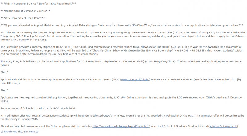 The key milestones and application procedures are as follows: Step 1: Applicants should first submit an initial application at the RGC's Online Application System (OAS) (www.rgc.edu.hk/hkphd) to obtain a RGC reference number (RGC’s deadline: 1 December 2015 [by noon HK time]). Step 2: Applicants are then required to submit full application, together with supporting documents, to CityU's Online Admission System, and quote the RGC reference number (CityU’s deadline: 7 December 2015). Announcement of Fellowship results by the RGC: March 2016 Firm admission offer with regular postgraduate studentship will be given to selected CityU’s nominees, even if they are not awarded the Fellowship by the RGC. The admission offer will be confirmed by the University in January 2016. Should you wish to know more about the Scheme, please visit our website (https://www.cityu.edu.hk/sgs/hkphd/index.htm) or contact School of Graduate Studies by email{ sgfellow@cityu.edu.hk}. ---------------------------------------------- Ka-Chun Wong BEng, MPhil (CUHK), PhD (Toronto) Assistant Professor Computer Science City University of Hong Kong Email: kc.w@cityu.edu.hk Web: https://www6.cityu.edu.hk/stfprofile/kc.w.htm |