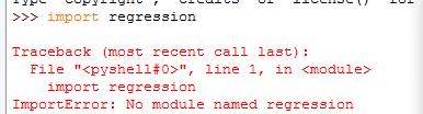 刚刚接触python,使用import之后就报错,请求大牛解答 有一个叫做regression.py的文件,现在我需要import regression,执行与报错情况如图所示。是我的路径不对还是怎么回事呀? 1.jpg |
