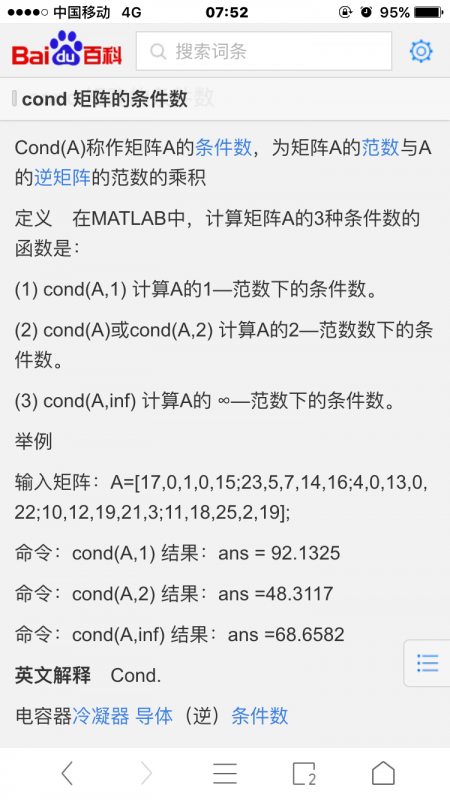 朋友,在每一次n的循环中,填充一行值对吧?在没有填充完之前,貌似H矩阵的值都为零呢,貌似不存在逆矩阵的,这样cond好像就没办法计算了啊,一点儿愚见,如果说错了还请指正啊,毕竟我连函数啥意思都忘记了…… 发自小木虫IOS客户端 |