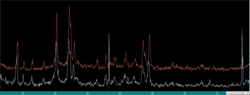 如图,白线这一次做的,红线是以前做的,条件略有不同但物质应该差不多。但这次在36°和77°左右分别出现了奇怪的峰,用S/M检索也得不到合适的结果。 有没有可能只对这两个峰进行S/M,或者用这次的谱图扣除上次的再进行检索?这两个峰可能对应什么物质? XRD.png |