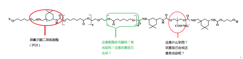 IPDI,聚己内酯二醇,二羟甲基丙酸,三者共聚。或者先IPDI+聚己内酯二醇,聚完再加二羟甲基丙酸 继续聚。 这个过程要控制NCO/OH的比例大于1,至于到底是多少,你要根据设计聚己内酯二醇和二羟甲基丙酸的含量以及目标分子量计算,计算方法参考高分子化学书逐步聚合一章,温度80度差不多了,时间我没做过不好说,最好用二正丁胺滴定法确定。聚合需要加催化剂,你可以先用DBTDL试试。 完成然后加1,3丙二醇,控制NCO/OH的比例小于1,也就是羟基过量,具体加多少还是要计算的,跟上边一样。这里的聚合时间可以滴定,也可以用红外测。峰位是2260cm-1消失 然后把温度降下来,大概四五十度就可以了,加碱中和。图中写的怪怪的,感觉水性聚氨酯用三乙胺比较多。 然后降到室温,向体系中滴加去离子水高速搅拌乳化就可以了。 但是这种带有明确封端的线性结构,分子量很难做高的,一般难超过1W,再高就很难控制了,而且分散过程也会出问题。 |