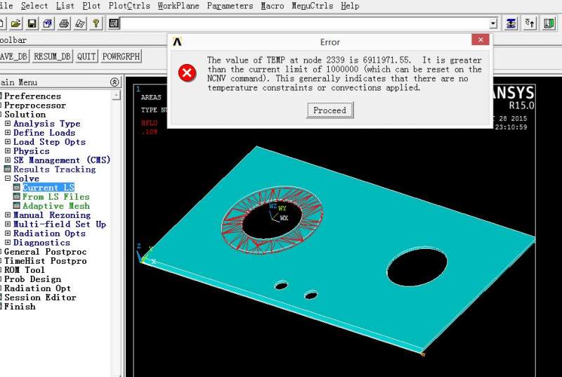 小弟ANSYS 新手,现在要模拟灶具上火焰对面板的影响情况。我是想在一块带孔的玻璃面板上加热流密度(加在孔附近),查看面板各处的温度分布情况。但是点击solve后,出现下面的图示的警告。请问各位大神,为什么会出现这种情况?怎么解决呢? 谢谢!!! 注:我选的是solid90单元 面板.JPG 面板有这样的一个斜边.JPG |