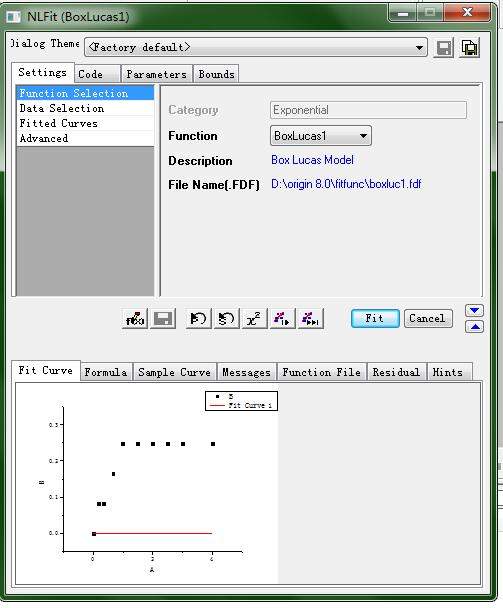 看到有网上说:用准一级动力学方程变形为:Qt=Qe(1-exp(-kt)) 形式,然后打开Origin,找Analysis----Fitting-----Exponential fit——boxlucas1即可。 我按照这个方法拟合结果出来的是一条直线而且没有方差的值,就是拟合失败了,高手能不能帮忙看一下是哪里错了。 这个是选取方程 拟合结果 |