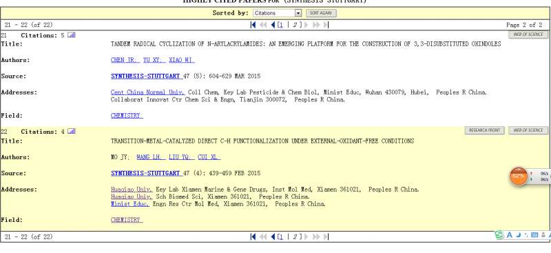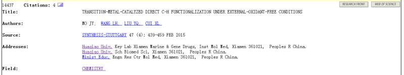 哪位大神能帮查一下这篇文章的ESI排名? Jiayu Mo, Lianhui Wang, Yunqi Liu, Xiuling Cui “Transition-Metal-Catalyzed Direct C−H Functionalization under External-Oxidant-Free Conditions” , Synthesis 2015, 47(4), 439-459. |