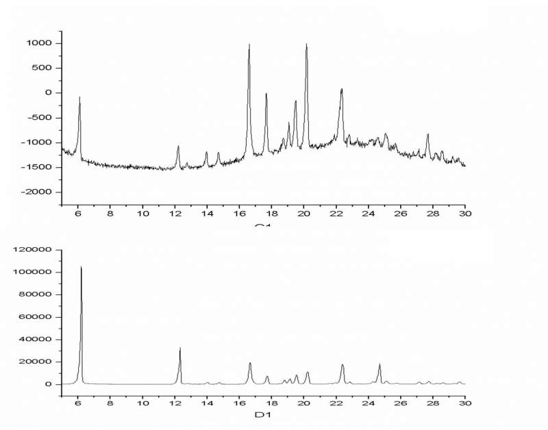 本人是晶体届外行,最近做了一个小分子药物的纳米晶体(上图),与原料药PXRD(下图)相比有所变化,但两者差异不大,请高手指点一下:这两个图谱相比,可以认定晶型发生了变化吗?另注:DSC测试表明,两者熔点有5℃的差异。纳米晶(上图)中基线的起伏请忽略,这是由其中含有的另一种无定型物质引起的。 图片1.jpg |