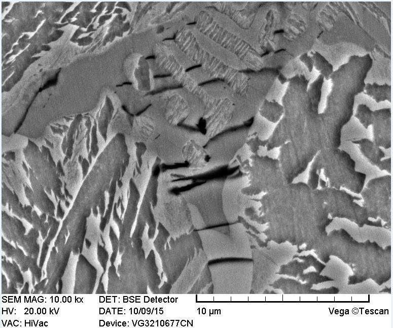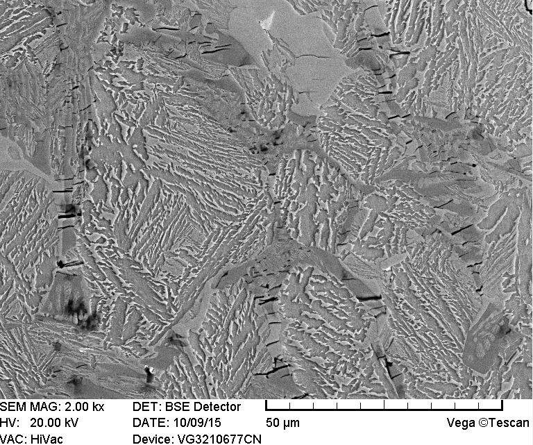 离心铸造产物,不知道材料的含碳量,HRC35-58,组织不均匀,请问这是过共析钢还是亚共晶白口铁呢?500倍的金相图中,我觉得晶粒内有板条马氏体、粒贝及魏氏组织,对吗?晶间长几百微米的树枝晶是什么呢?是碳化物还是仅仅是小尺度的基体?请高手们指教 裂纹处放大电镜图.JPG 洛氏硬度测试点周围压裂的组织电镜图.JPG 500倍金相组织.jpg |
