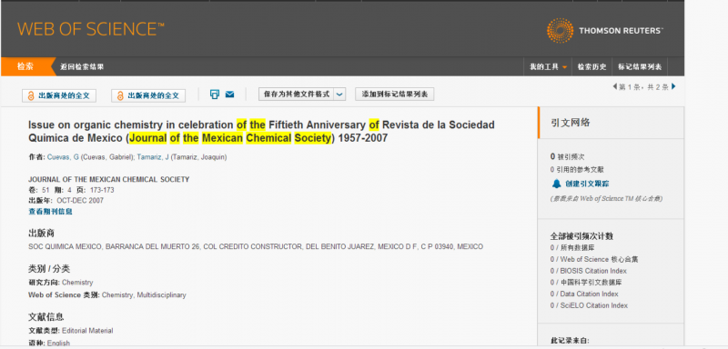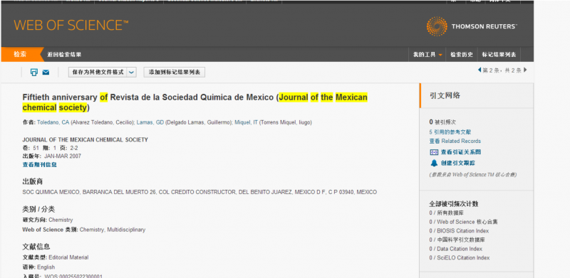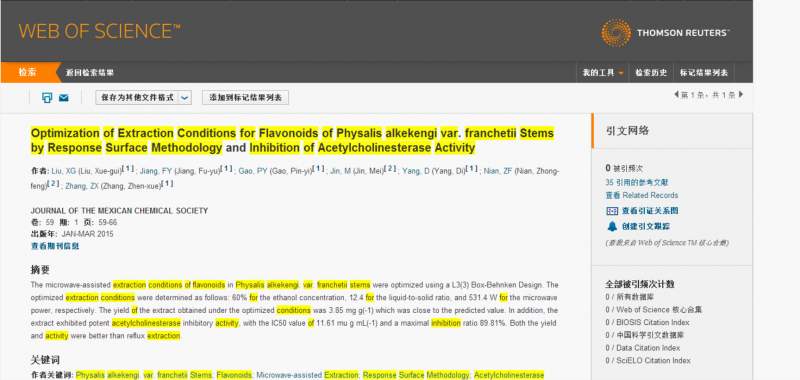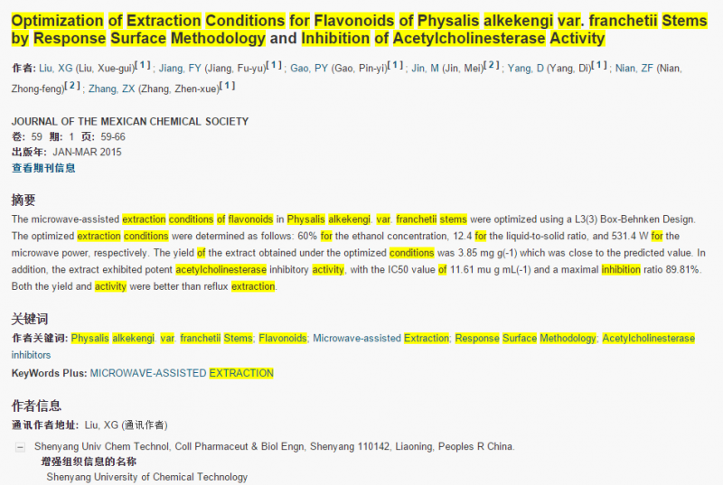 《Journal of the Mexican Chemical Society》帮我上web of science查一下截图发给我。再帮我把这篇文献《Optimization of Extraction Conditions for Flavonoids of Physalis alkekengi var. franchetii Stems by Response Surface Methodology and Inhibition of Acetylcholinesterase Activity》搜一下。一起截图发给我!!万分感激!!